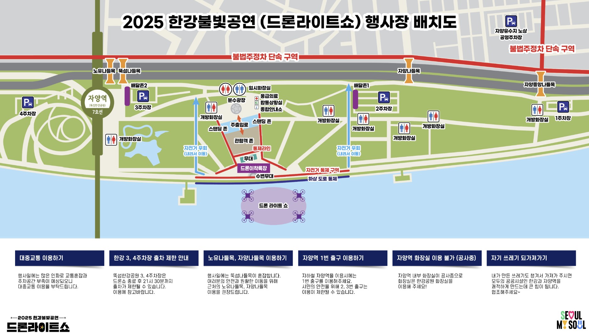 2025년 한강 드론쇼는 수천 대의 드론이 한강 밤하늘을 수놓는 대규모 야외 행사입니다. 많은 인파가 몰리는 만큼, 사전 준비와 현장 동선 파악이 쾌적한 관람의 핵심입니다. 아래 꿀팁들을 꼭 참고하세요! 여러분의 행복한 관람을 위해 자차를 이용할 시 주차꿀팁과 관람전후 맛집,카페정보도 함께 준비했습니다.